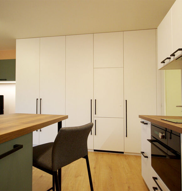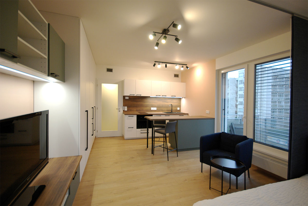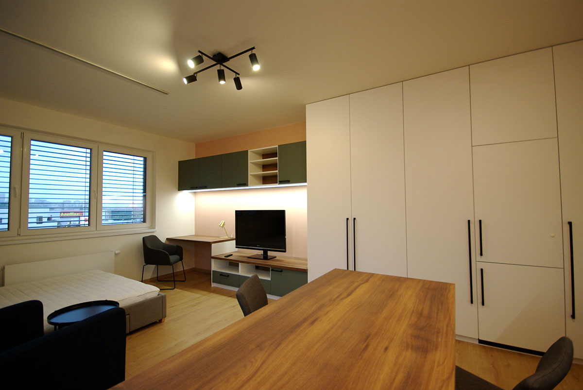 Pohodlná kuchyňská linka, jídelna, maximální úložný prostor, ložnice, obývací pokoj, pracovna – vše v jedné místnosti, ale bez pocitu přeplněnosti interiéru. Vše navrženo tak, aby byla místnost i nadále vzdušná a zachováno soukromí na spaní v podobě posuvných panelů.