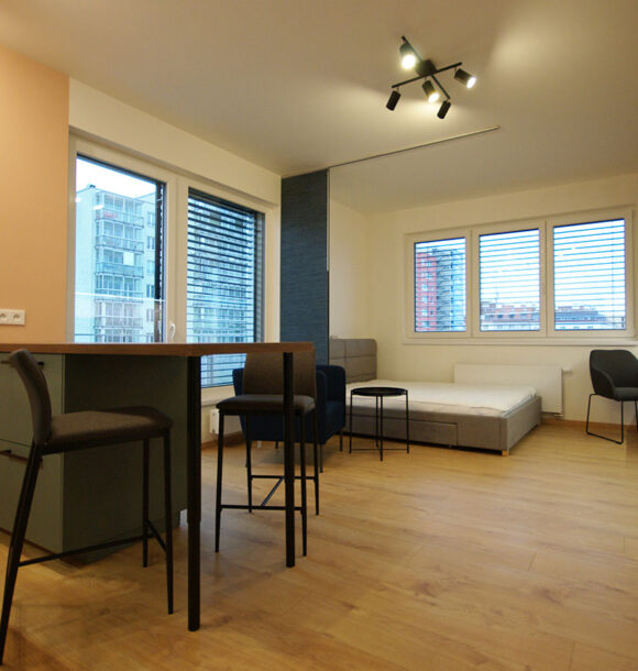 Tato garsonka je důkazem, že i malý prostor může nabídnout stylové a plně funkční bydlení. Design byl navržen tak, aby využil každý centimetr s maximální efektivitou, a zároveň poskytl moderní a útulné prostředí.